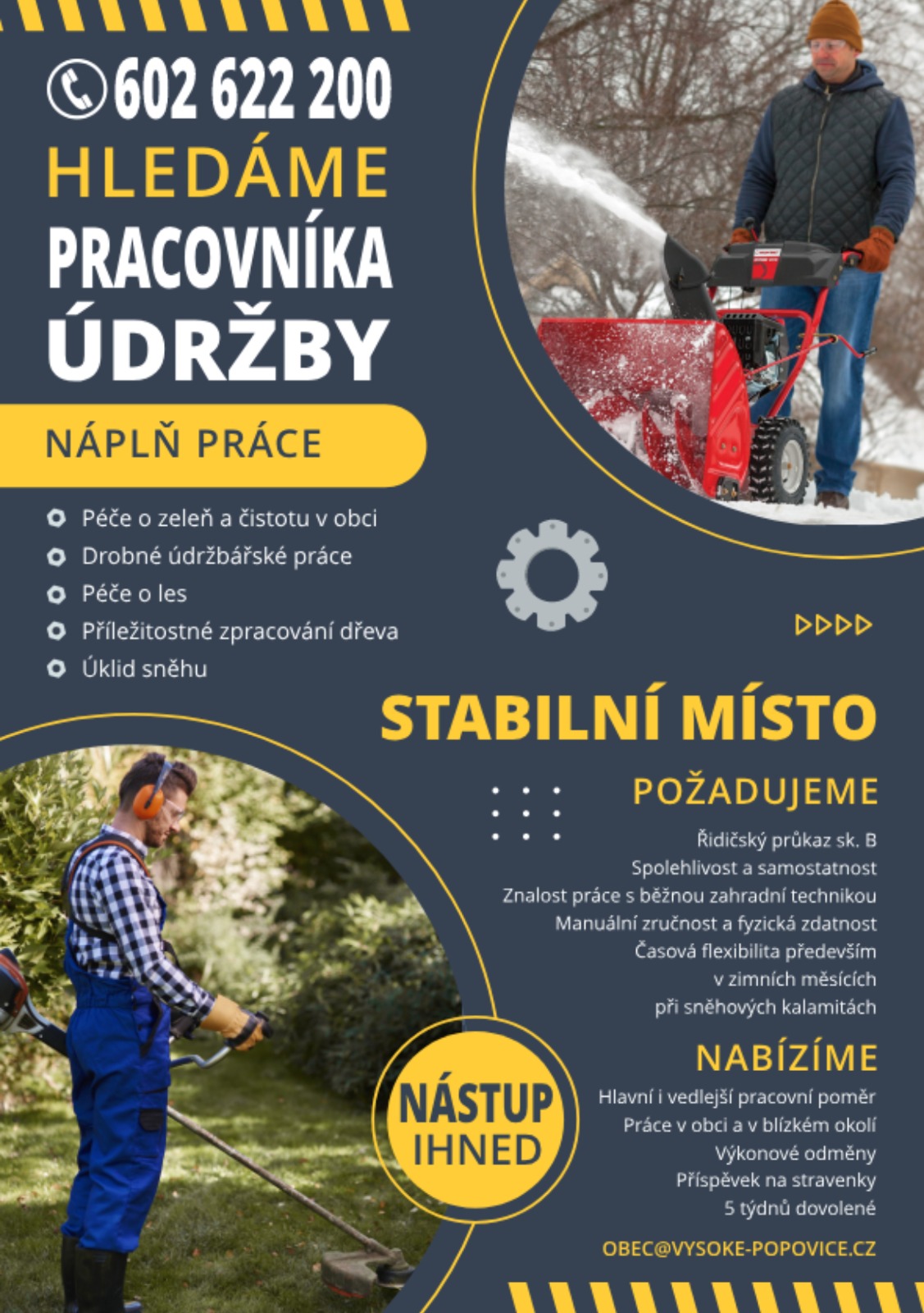 Obec Vysoké Popovice nabízí místo pracovníka údržby. Více informací zde.